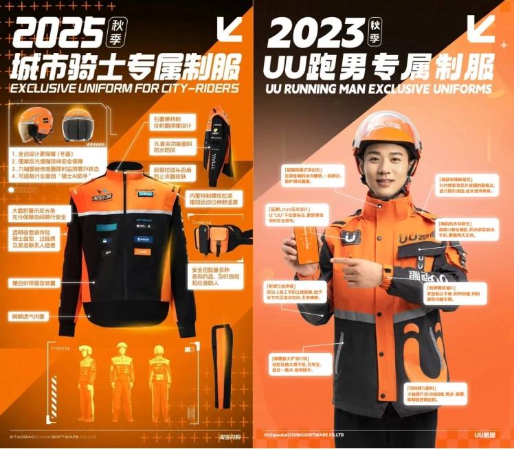 UU跑腿方面表示,其在2023年推出了“疾风系列”工装,而淘宝闪购的新工服在色系结构、版型架构以及功能细节等方面,与自家的“疾风系列”工装存在高度相似之处。为此,他们专门制作了对比图进行展示:两者的色系均采用黑色搭配亮橙色,色彩分布的比例以及反光条的位置几乎没有差异……