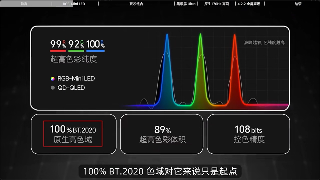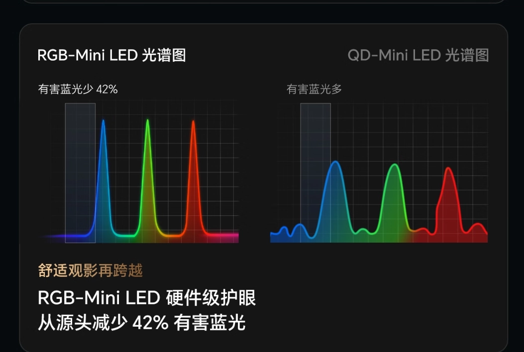 另一款热门机型TCL Q9M走的是差异化技术路线,它采用BG双色背光加红色KSF荧光粉的方案,具体来说就是依靠蓝色和绿色两种发光芯片,再搭配红色KSF荧光粉来达成三色显示。从技术原理层面分析,这种方案的屏幕光谱在红色波段会有明显的杂峰,长时间使用后,可能会存在偏色、串色的潜在问题。不过从实际表现情况来看,85英寸的TCL Q9M也实现了100% BT.2020色域覆盖,色纯度数据的表现不错,能够满足日常观影、追剧这类基础场景的使用需求。