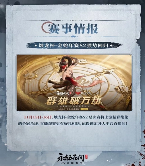 S9赛季期间,烛龙杯将强势回归。作为《永劫无间手游》的重要赛事,烛龙杯始终备受玩家关注。本次赛事除了呈现精彩对决,还会通过直播观赛为观众送出丰厚福利。与此同时,高校赛也将继续激烈进行,为校园玩家提供展现自我的平台,点燃更多年轻玩家的热情。