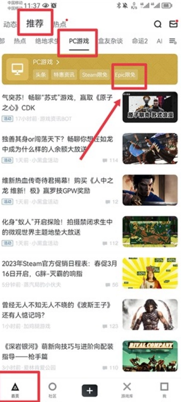 打开小黑盒子APP,进入首页后,在顶部的栏目区域,从“推荐”板块里找到PC游戏栏目,接着就能点击“Epic限免”了。