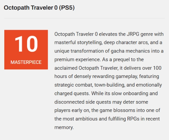 测评者表示,作为广受好评的《八方旅人》的前传,《八方旅人0》通过精妙的叙事手法、立体的角色刻画,以及对抽卡玩法的出色调整,把JRPG这一类型推向了新的水准。这款游戏带来了超100小时的丰富游玩内容,涵盖了讲究策略的战斗、趣味十足的城镇建设,还有情感充沛的支线剧情。虽然游戏刚开始时的节奏偏慢,部分支线任务也稍显零散,但它最终还是成为了近年里最具魄力且能带来满满成就感的RPG作品之一。