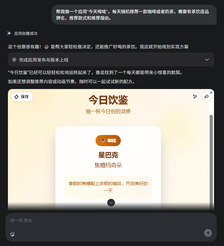 我们再举个例子,小雷每天下午都会想喝点东西,可在选择饮品时总是犹豫不决。于是他打算用一句话做个“今日饮品推荐”的小应用,没想到很快就搞定了,系统给他推荐了一杯星巴克的焦糖玛奇朵,尝过之后发现味道确实很棒。