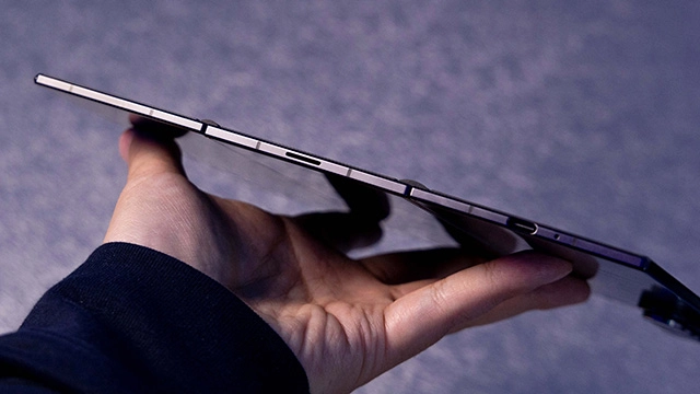 三星Galaxy Z TriFold采用向内多次折叠的设计,用户经过两次展开后,就能看到一块10英寸的大屏。闭合时,6.5英寸的外屏可以带来旗舰手机的完整使用体验。完全展开时,这款手机的机身厚度仅约3.9毫米,是目前最薄的Galaxy机型。此外,三星Galaxy Z TriFold的内折设计有助于更好地保护主屏,加上两个不同尺寸的双轨结构铰链配合工作,不仅能实现轻松顺滑、稳定流畅的开合,还能让屏幕贴合得更紧密,进一步减小折叠后的厚度。