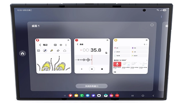 过去得依靠外接显示设备才能使用的Samsung DeX,如今在三星Galaxy Z TriFold上能够直接本地独立运行了。和之前不一样的是,开启DeX模式后,用户最多能创建四个独立桌面,每个桌面都可以同时运行五个应用程序,这样用户在不同场景下就能快速切换桌面,从而提升效率。要是需要两块大屏协同操作,用户还能连接外部显示设备,借助扩展模式来实现类似PC的高效交互体验。