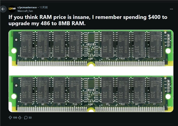 他提到的90年代内存涨价,具体指向的是90年代PC向家庭用户普及的那个阶段,特别是微软推出Win95系统之后——图形界面的诞生对PC配置提出了更高要求,内存需求在短时间内急剧增长,最终引发了1995到1996年间的内存大幅涨价,内存条价格从几美元飙升至几十甚至上百美元。