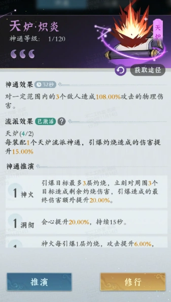 天炉流以引爆灼烧作为核心机制,十分适配物理输出。其核心神通为天炉·陨火,推荐搭配天炉·炽炎、天炉·流萤以及天炉·丹朱。天炉流派的核心加成颇为简易,只需装备任意两个天炉神通,就能激活流派效果。天炉流具备更强的爆发能力,特别适合偏好一击必杀的仙长。仙长们可借助引爆灼烧效果,对范围内的敌人造成毁灭性打击。要是未能凑齐核心神通,也能够选择火系紫色神通。