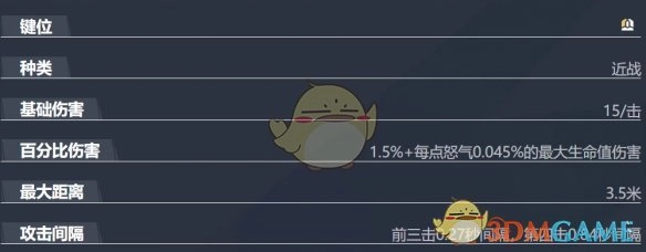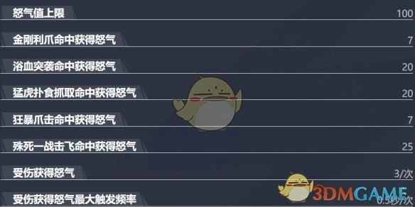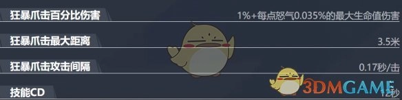 被动技能 - 狂战士之怒:每当进行攻击或者受到伤害时,怒气值都会增加。怒气值的提升,能够强化爪击所附带的百分比伤害,同时也会让再生愈合因子产生更多额外生命值。