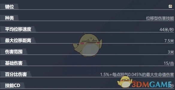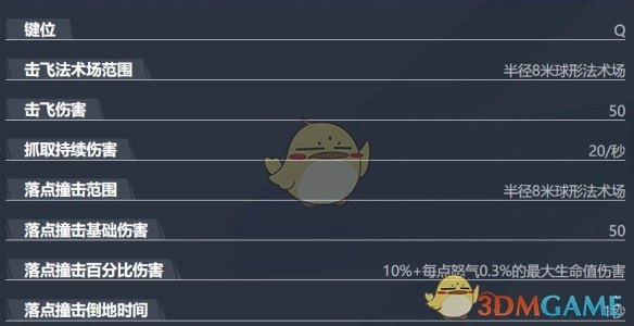Q技能 - 殊死一战:将面前的敌人击飞,随后跃至空中,在空中旋转着向目标点冲刺,把途经的敌人一同卷入,到达落点时引发一次极具毁灭性的撞击,同时额外造成基于怒气值一定百分比的伤害。