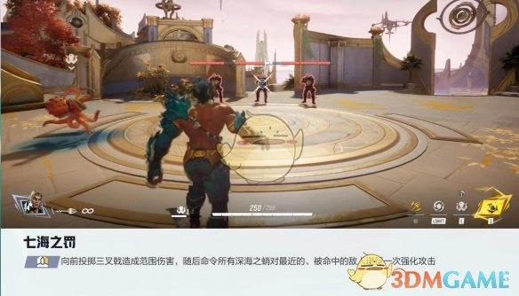 向前掷出三叉戟,引发范围伤害,紧接着指挥所有深海之蛸,对距离最近且被命中的敌人发动一次强化攻击。