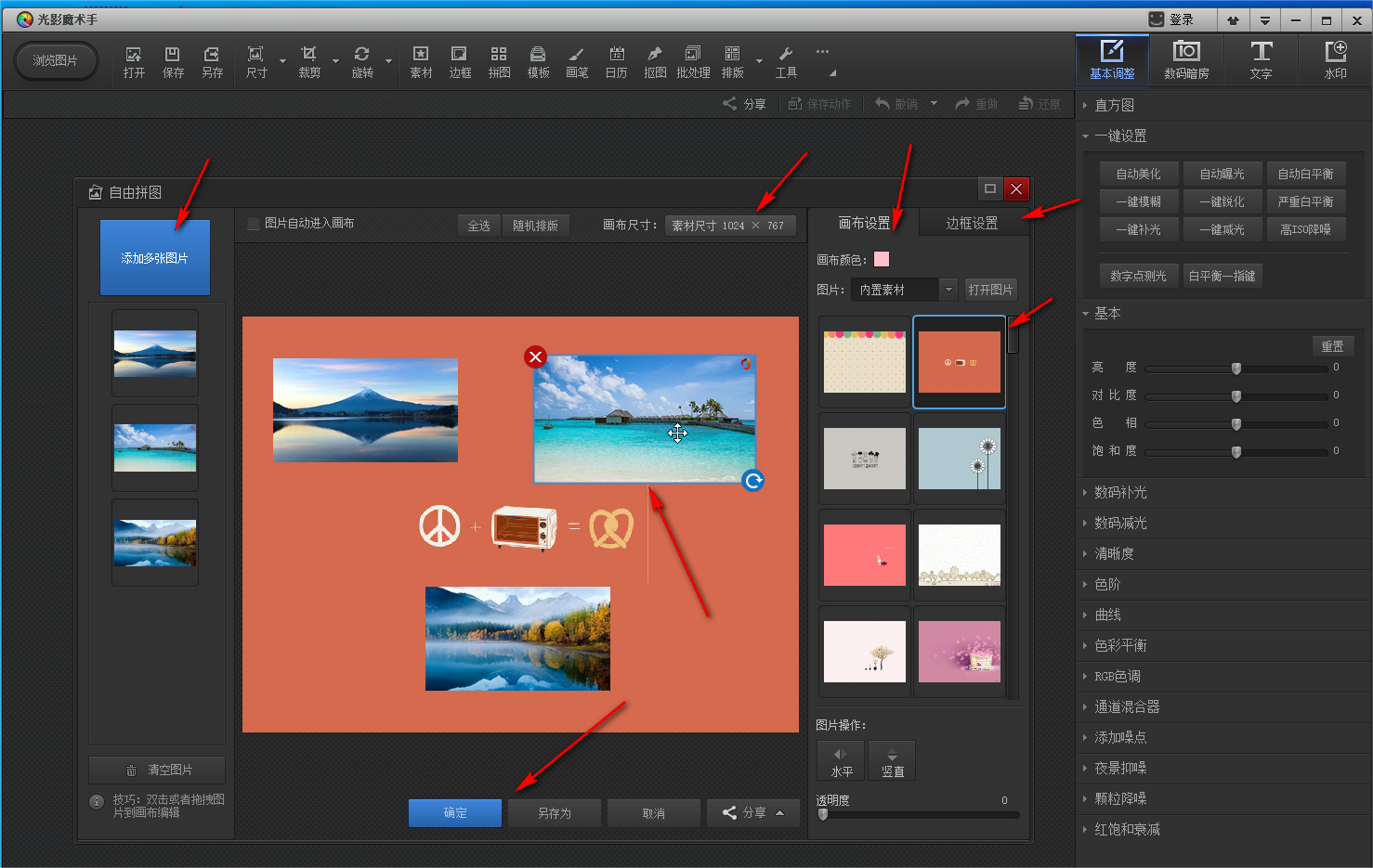 接下来,在打开的文件选择窗口里,按住Ctrl键的同时逐个点击需要拼接的图片,完成选择后点击“打开”按钮把这些图片导入进来。在界面右侧,你可以挑选各类画布效果,还能把图片拖到画布上你觉得合适的位置。要是有需要的话,也可以调整画布尺寸之类的参数,全部设置好后点击“确定”按钮,就能完成自由拼图的操作了。