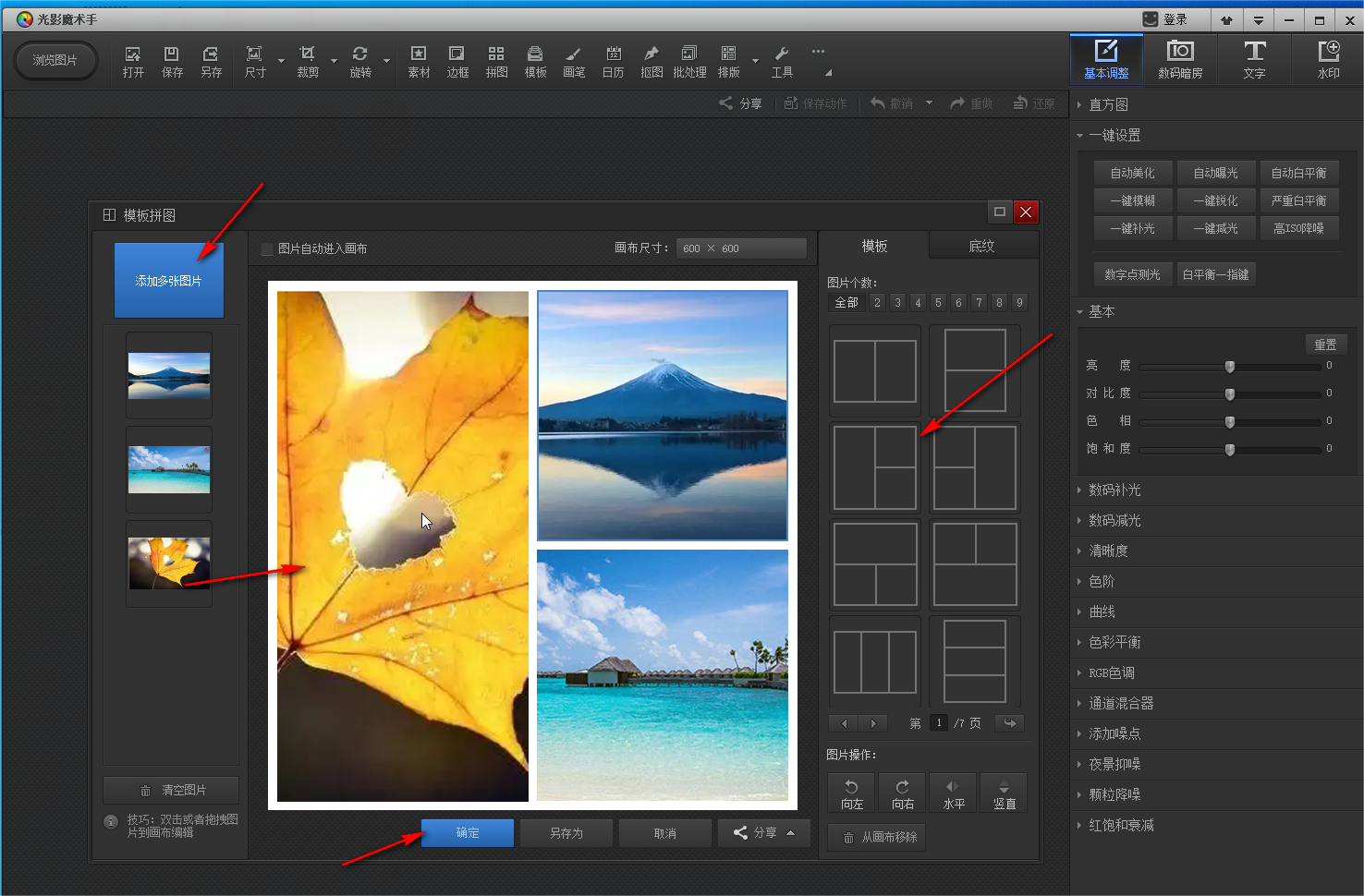 同样地,在导入图片后,您可以在右侧浏览并挑选喜欢的模板效果。接着,把图片拖拽到模板里您期望的位置,最后确认就完成了。