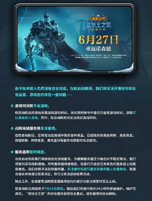在软启动期间,玩家不用花费游戏时间就能登录游戏,尽情体验魔兽世界的魅力。不过要留意,该阶段商城商品购买、角色转移、改名、阵营转换、种族变更以及角色直升服务等功能会暂时关闭,玩家需耐心等候正式服务的完全开启。