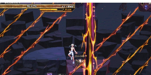 2、随后boss回到场中,我们跳跃躲避地震,随后控制角色一边躲线一边放置坠落悬崖。