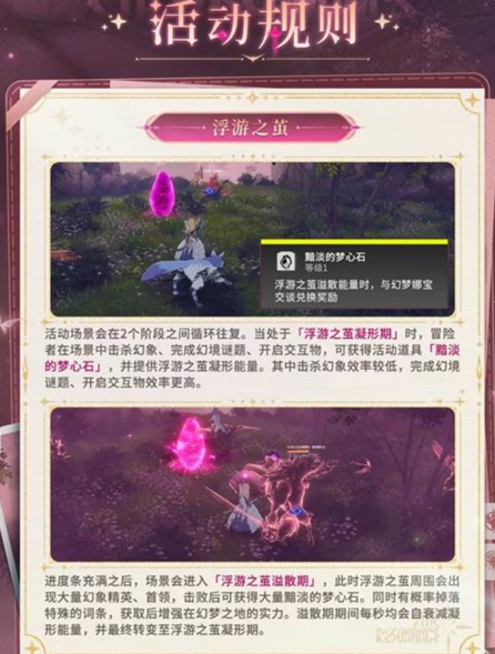 活动场景会在两个阶段间循环交替。当进入「浮游之茧凝形期」时,冒险者在场景内击杀幻象、完成幻境谜题或开启交互物,都能获取活动道具「黯淡的梦心石」,同时为浮游之茧凝形提供能量。不过三者中,击杀幻象的效率相对较低,而完成幻境谜题与开启交互物的效率会更高一些。