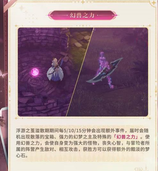 在浮游之茧溢散的过程中,每隔5分钟、10分钟或15分钟就会触发额外事件。此时,场景里会随机出现散落的宝箱、实力强劲的幻梦之主,还有特殊的「幻兽之力」。一旦使用了幻兽之力,使用者会化身成强大的怪物,失去理智,并且会和冒险者所在的阵营变成敌对关系,双方会互相攻击。最终获胜的一方,能够得到额外的黯淡的梦心石。