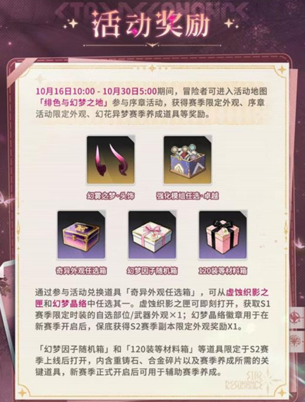 在10月16日上午10点到10月30日凌晨5点这个时间段里,冒险者们能够进入活动地图「绯色与幻梦之地」参加序章活动,赢取赛季限定外观、序章活动限定外观、幻花异梦赛季养成道具之类的奖励。
