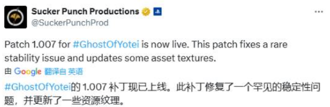 《羊蹄山之魂》今日刚发布没多久,开发团队Sucker Punch就紧急推出了版本号为1.007的第二个补丁。这个补丁大小只有261MB,主要针对偶发的稳定性问题进行了修复,还优化更新了部分游戏资源的纹理细节,让游戏体验得到了进一步提升。