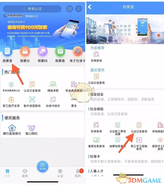 3、若要查询认证结果,点击“我要查”,接着选择“社会保险”选项,最后点击“认证记录查询”。