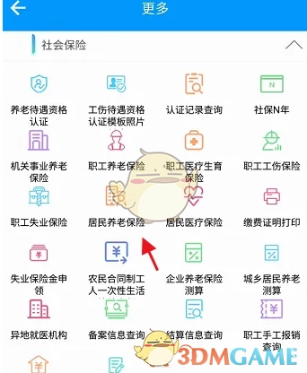 6、点击“更多”,在其中找到“社会保险”,接着点击下方的“居民养老保险信息”
