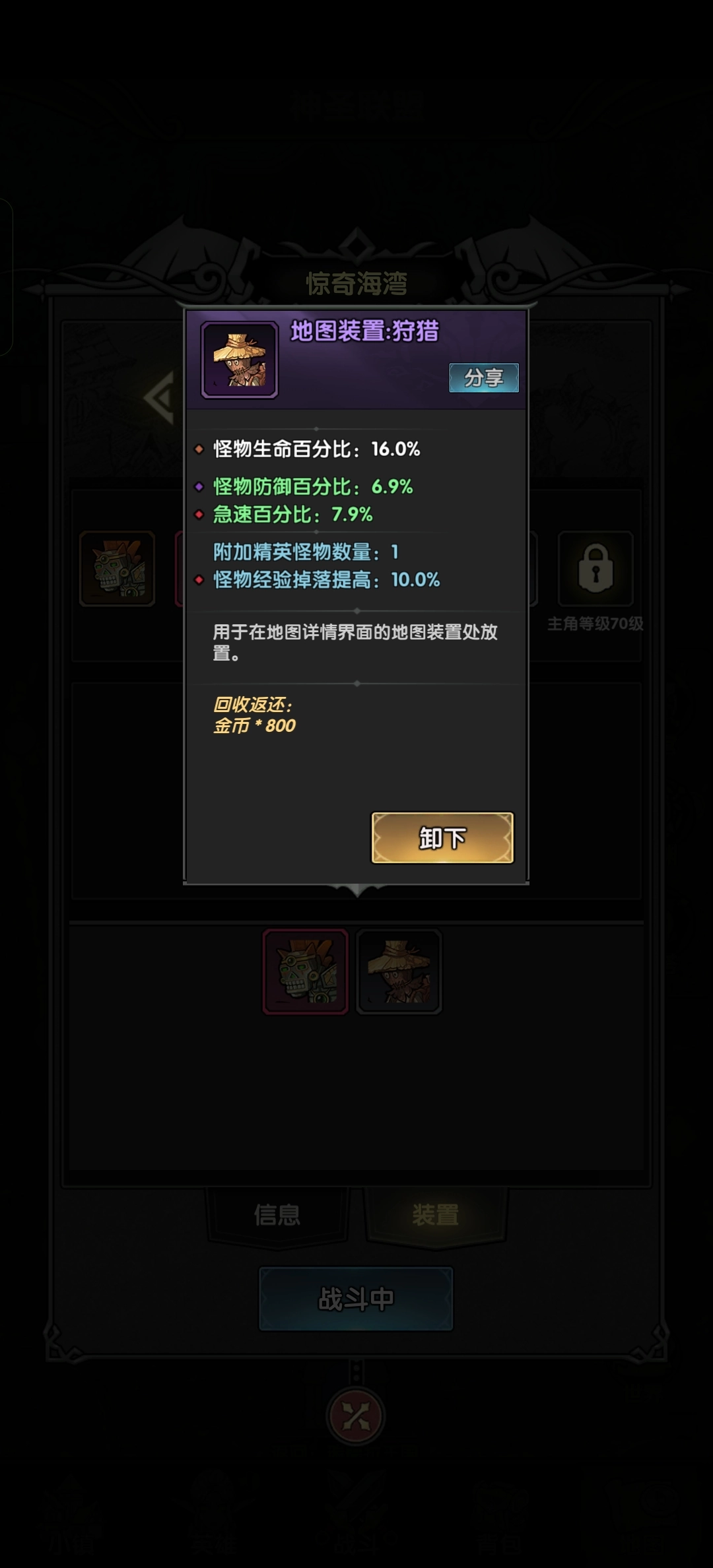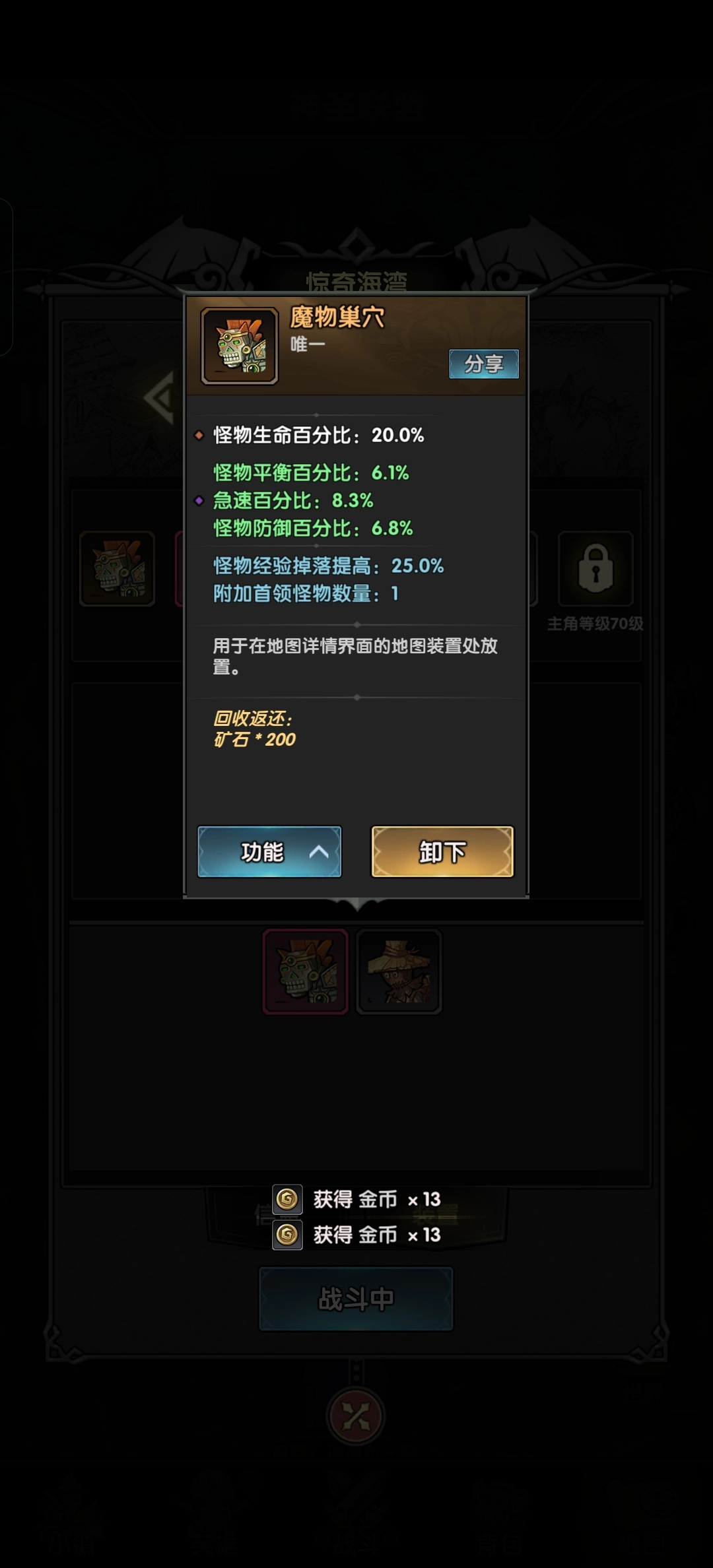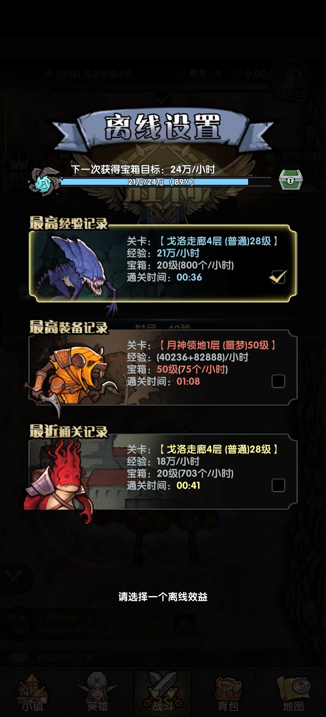 建议在70级之前挂机副本选择28级图,此图通关能达到36秒。而29级图最快也要41秒,其余情况也都在40多秒,多这几秒收益就多了好几万。按照我推荐的装置搭配,战斗等级50时挂29级图,收益可以达到16万;战斗等级60挂28级图,目前收益是21万,一般来说达到20万没问题。如果收益没达到这个水平,可以考虑升级快一些。