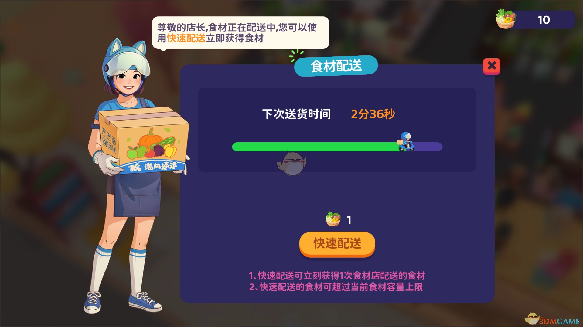 即时召唤配送:使用菜篮子就能立刻召唤小运,让其迅速完成一次食材配送,一次就能补充大量食材。