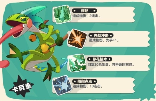 在物理技能领域,藤鞭属于经典的双重攻击技能,于战斗伊始便能稳定打出伤害;先制冲击则拥有 +1 的先手优势,能助力卡瓦重抢占先机,快速压制敌手。当面临需要保命的情形时,移花接木堪称极为实用的技能,它不但能让卡瓦重恢复 20% 的生命值,还可将其收回背包,防止被击败。最后,指指点点是一个 10 连击技能,累积伤害相当可观,且能针对对手的被动特性,是极为灵活的技能之选。