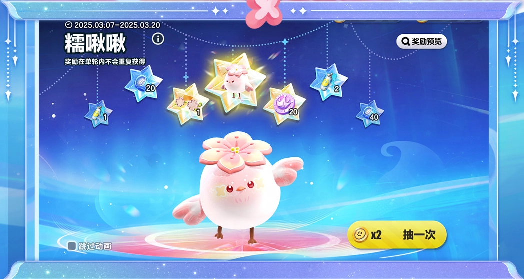3月7日(周五)零点,<糯啾啾>正式上线,蛋仔们只需使用许愿币就能参与抽奖活动,七轮必定中奖。