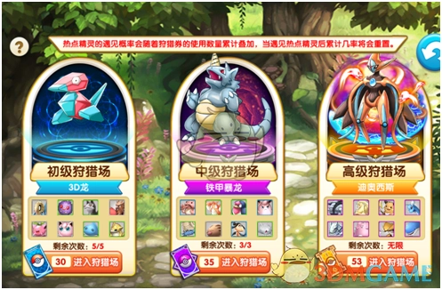 2、每个狩猎场对应一个热点精灵,热点精灵每周日刷新;