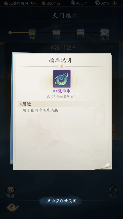 每一位带着勇气踏入天门墟试炼之地的道友,不论最终是成功还是失败,都能获得一份独特的馈赠——一定数量的【幻境仙币】。这种仙币,是天门墟特有的神秘货币,在位于天门墟深处的秘藏商店里,使用幻境仙币能够兑换各种各样的珍稀奇物。