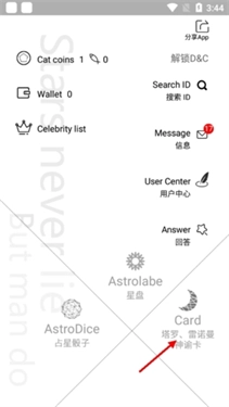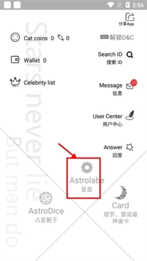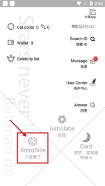 1、占星猫在完成登录后,用户可以使用占卜自身运势等功能,具体操作是在软件主页面中选择左下角的“占星骰子”选项。