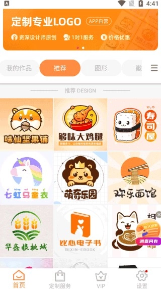 Logo设计,也称作Logo商标设计,是一款能满足用户Logo设计需求的制作软件。在这里,用户能够尽情释放创意,对文字展开编辑,融入自己独特的想法,还能轻松绘图,各种画笔颜色等工具一应俱全。用户可在线自定义心中理想的Logo样式,也能选择在线私人订制,更加省心省力。如此一来,能让你的品牌别具一格且清晰醒目。此外,软件还提供商业、校园、艺术、餐饮、建筑、教育等多种类型供你选择使用。