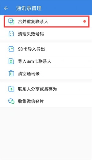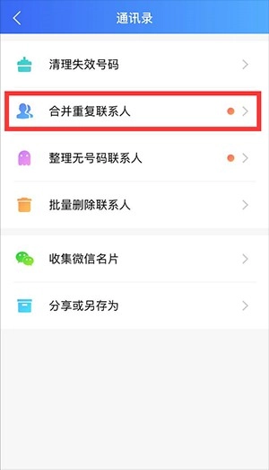 您可在右下角的【我的】菜单里,找到【通讯录】选项,该选项中具备“合并重复联系人”功能,点击进入此功能后,依照相关指引操作就行。