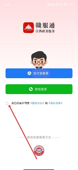 进入登录页面后,首先需要点击勾选按钮,以同意服务协议和隐私政策。