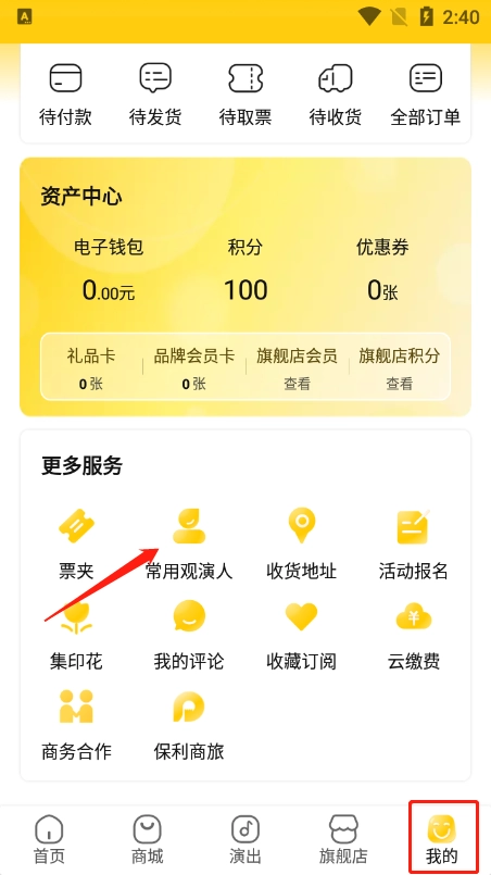 1. 第一步,打开后点击下方功能栏里的【我的】,接着点击【常用观演人】。