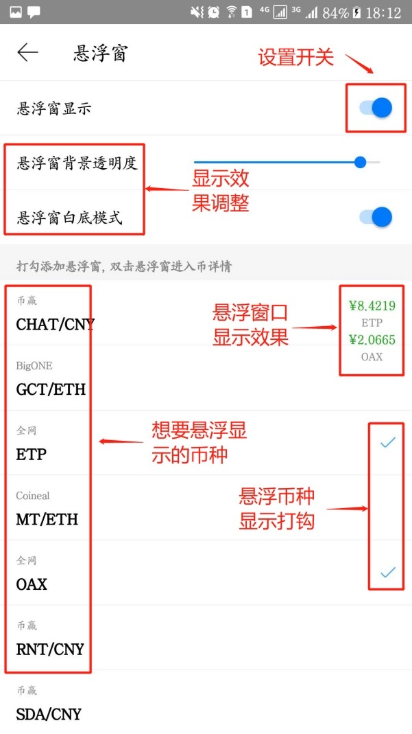 4、也能够对悬浮窗口的显示效果进行设置,只需点击希望以悬浮形式显示的币种,就能达成窗口悬浮的效果。