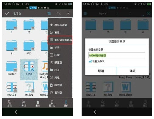 若您有文件需要备份至网络硬盘,无需反复进行切换、复制和粘贴操作。只需长按文件,点击“更多”,再选择“备份到网络硬盘”即可。系统会默认在网络硬盘中创建一个名为“XX的ES备份”的备份目录,您能够对该名称进行编辑,并决定是否将其设为默认。