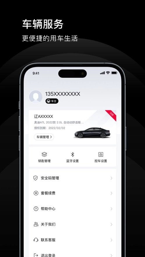 【我的】:车辆管理、钥匙授权管理、产品OTA升级、联系客服