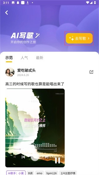 1、打开,在顶部的功能栏中选择【AI写歌】。