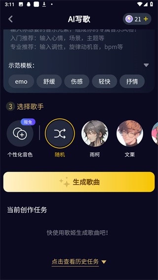 5、挑选一个虚拟个性化音色,接着点击生成歌曲就可以了。
