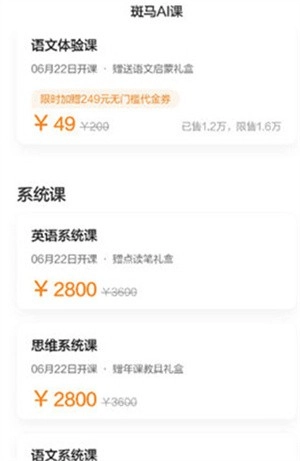 3、体验课程涵盖英语体验课、思维体验课以及语文体验课。每个课程均分为两个部分,共计10个课程。目前收费49元,可依据3个年龄段进行选择。