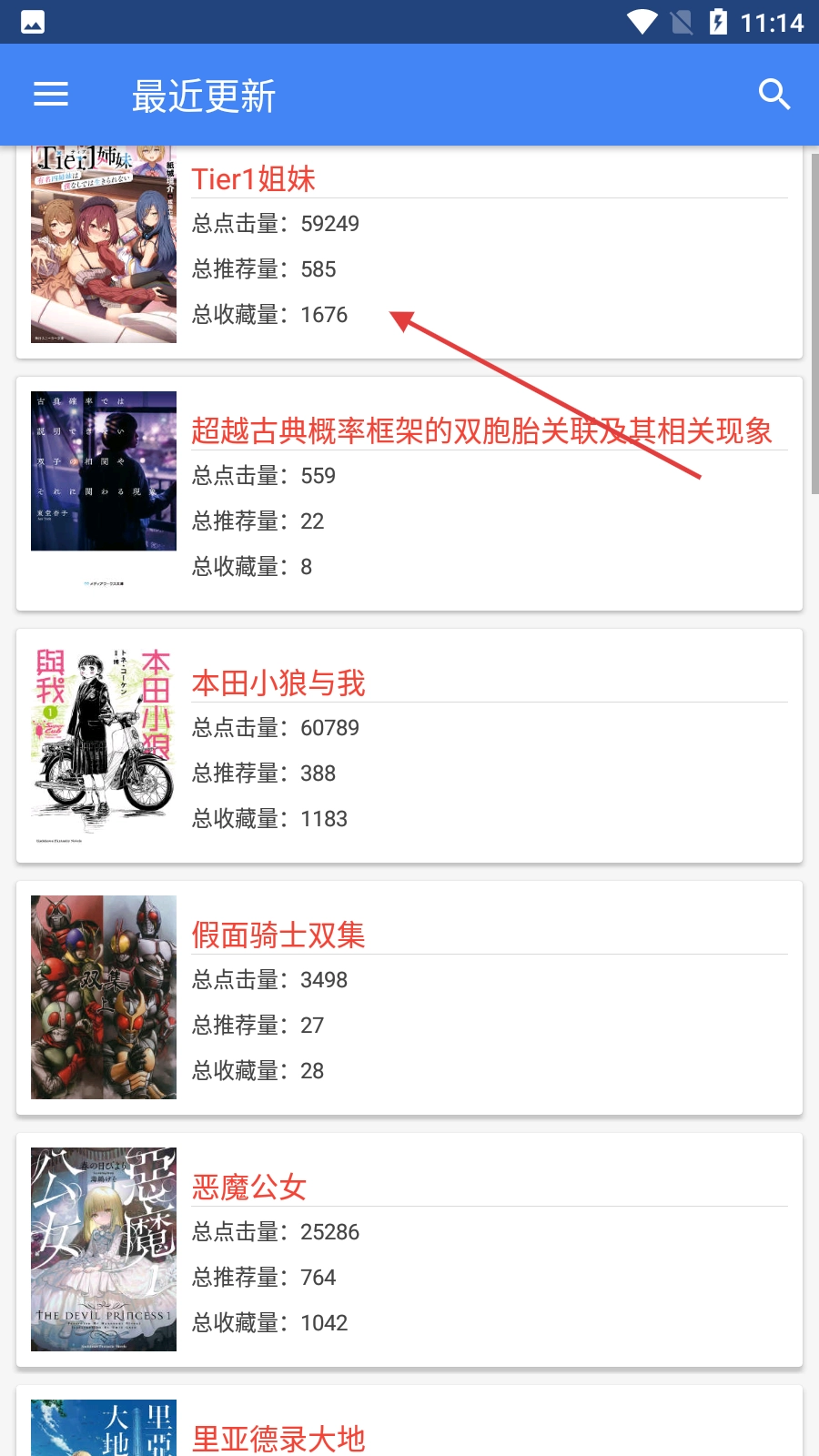 1、在“最近更新”列表中,找到【Tier1姐妹】并点击,可进入该小说详情页,查看点击量、推荐量等信息。