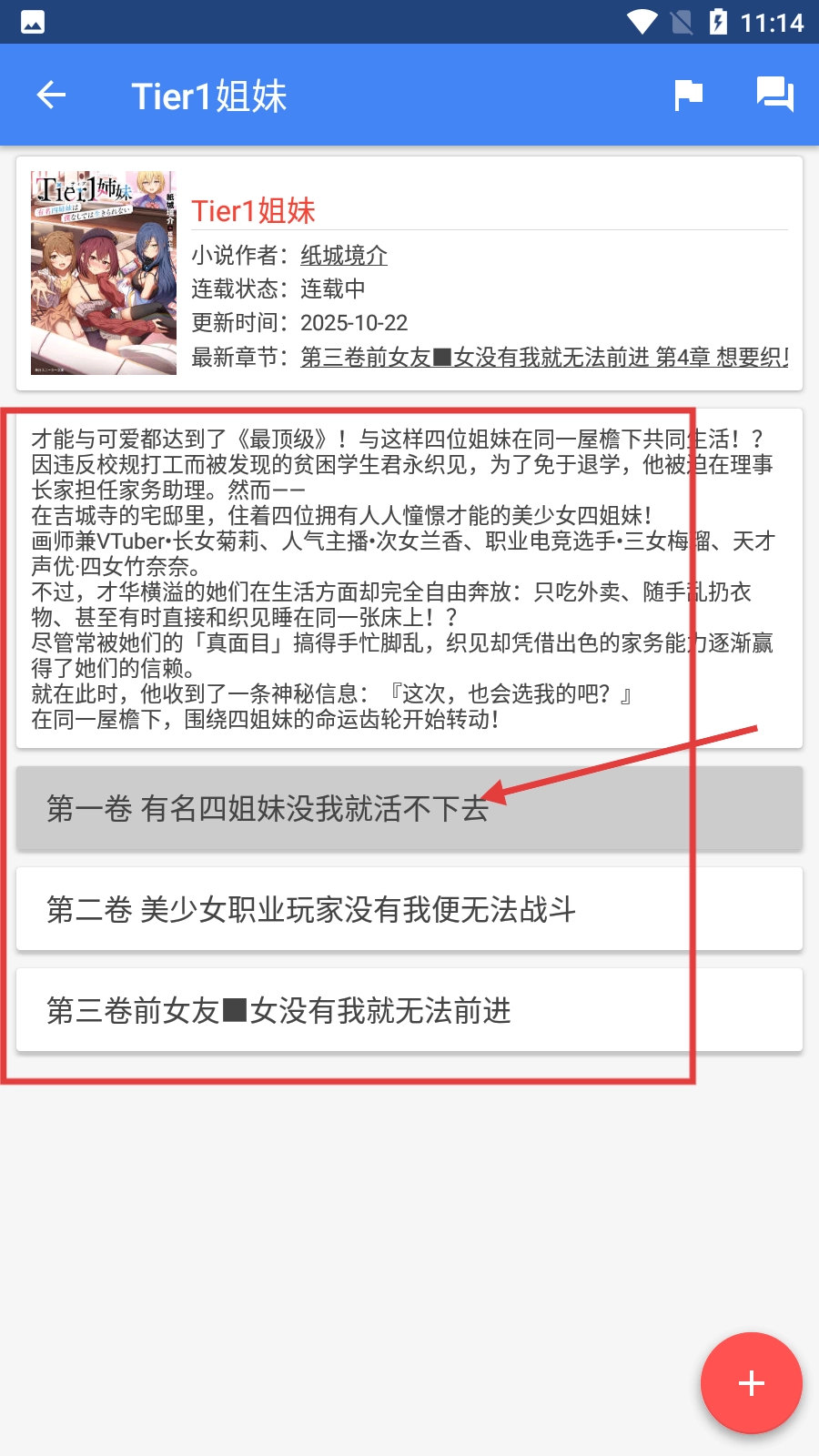 2、进入【Tier1姐妹】详情页,可查看作者【纸城境介】、连载状态,还能选择卷数。
