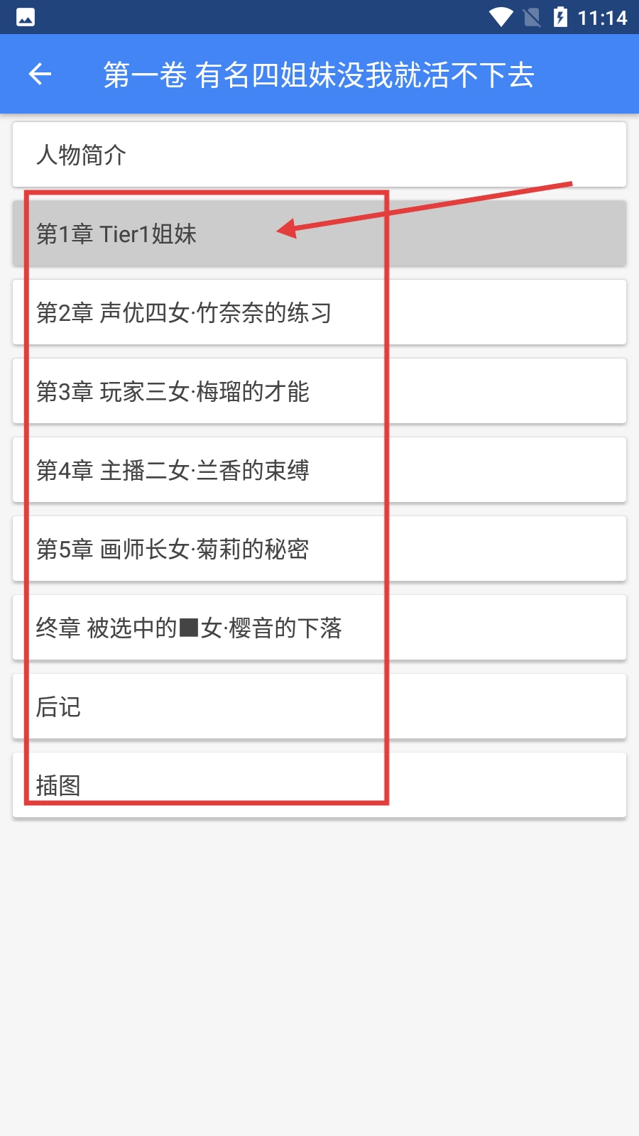 3、在第一卷章节列表中,点击【第1章 Tier1姐妹】,可进入该章节的阅读界面。