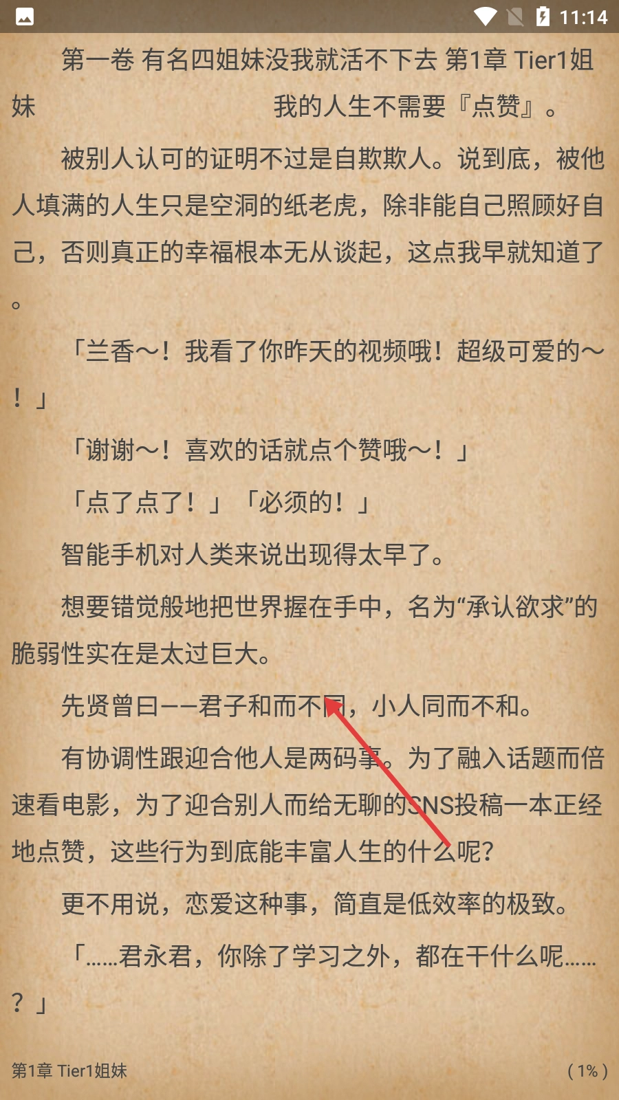 4、进入【第1章 Tier1姐妹】阅读界面,即可开始阅读小说内容,界面显示章节进度等信息。