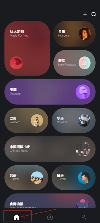2、进入应用默认展示主页内容,在此不仅可以看到各种歌曲板块,比如金曲、新歌等,还支持用户自定义,可以将自己的喜欢的板块放置在首页。