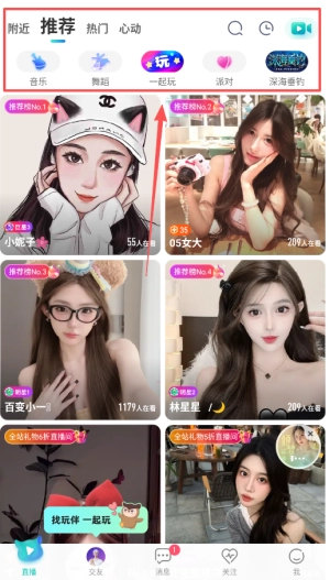 在首页,用户既能按照分类浏览音乐、游戏等不同类型的直播内容,也可以借助搜索功能查找特定的主播或活动。