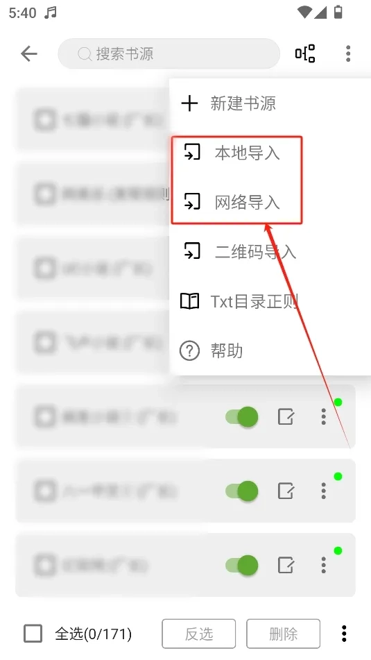 3、选择导入方式:找到并点击页面右上角的三点图标,弹出菜单后,根据实际情况在菜单里选择【本地导入】或【网络导入】。