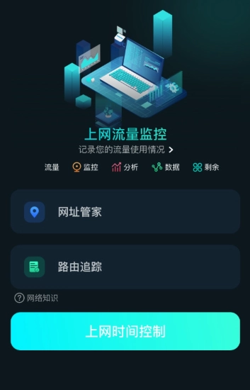 点击进入“上网”功能区,启用网址管家与路由追踪功能,然后点击保存或开始按钮。