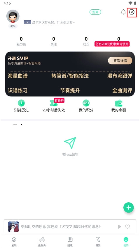 1、点击右下角的【我的】选项,再点击右上方的齿轮形状图标,即可进入设置页面。