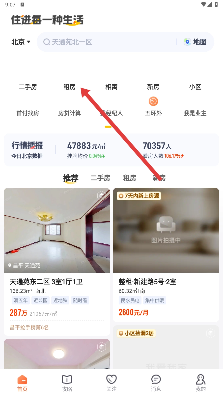 1、打开我爱我家APP,在首页找到【租房】选项并点击,就能进入租房专区啦。